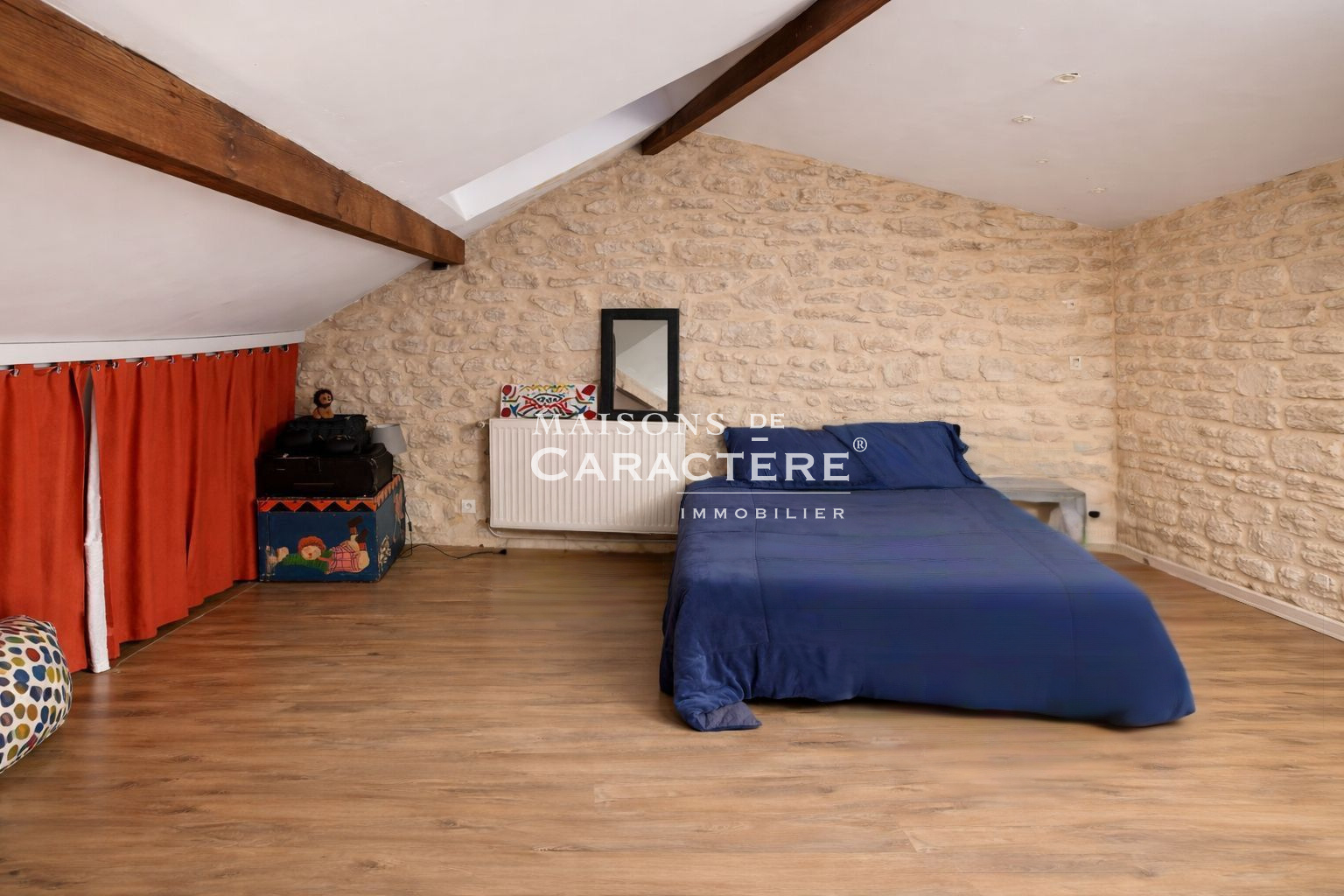 A l’étage, une mezzanine aménagée en espace bureau dessert une vaste chambre et une salle de jeux, aisément transformable en chambre supplémentaire. Cet espace bénéficie d’un accès indépendant, idéal pour l’exercice d’une profession libérale ou la création d’un espace autonome.