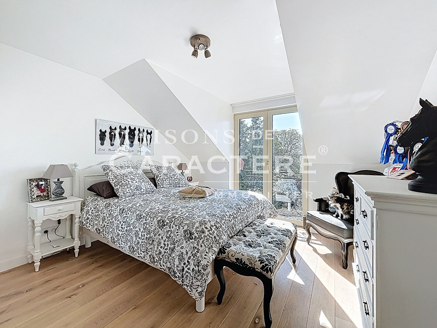 A l’étage, l’espace nuit se compose de quatre chambres, dont une avec salle d’eau privative, ainsi qu’une salle de bains équipée d’une baignoire et d’une douche à l’italienne, et un WC indépendant.