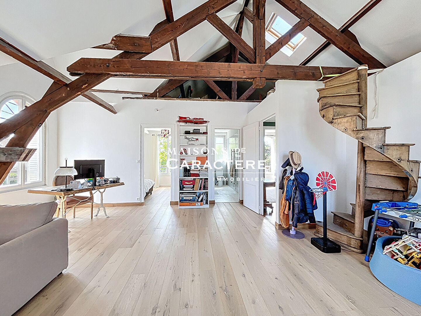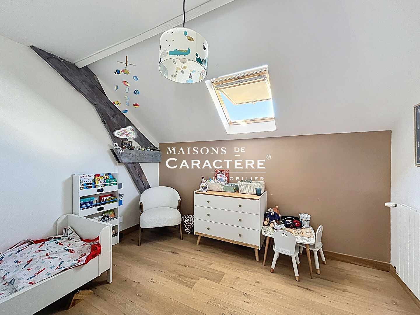 L’étage est agencé actuellement en une généreuse Family Room, 3 chambres, ainsi qu’une Salle d’eau avec wc permet une installation immédiate, mais les familles nombreuses y verront le potentiel de 2 chambres supplémentaires. Grenier ouvert pour un très bel effet « cathédral » de 4,71 mètres de hauteur.